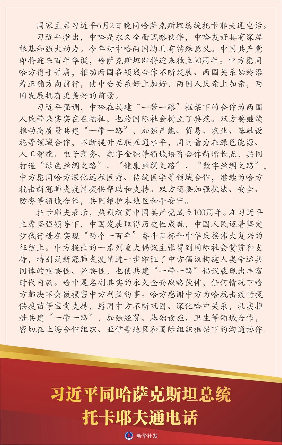 习近平强调,中哈在共建“一带一路”框架下的合作为两国人民带来实实在在福祉,也为国际社会树立了典范。双方要继续推动高质量共建“一带一路”,加强产能、贸易、农业、基础设施等领域合作,不断提升互联互通水平,同时着力在绿色能源、人工智能、电子商务、数字金融等领域培育合作新增长点,共同打造“绿色丝绸之路”、“健康丝绸之路”、“数字丝绸之路”。中方愿同哈方深化远程医疗、传统医学等领域合作,继续为哈方抗击新冠肺炎疫情提供帮助和支持。双方还要加强执法、安全、防务等领域合作,共同维护本地区和平安宁。